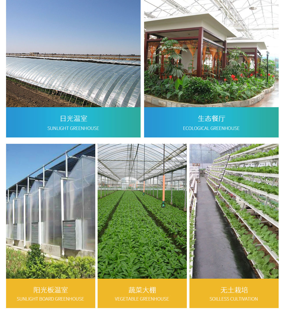 我們的主導(dǎo)產(chǎn)品有:玻璃溫室、智能溫室、陽(yáng)光板溫室、生態(tài)餐廳、日光溫室